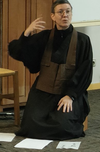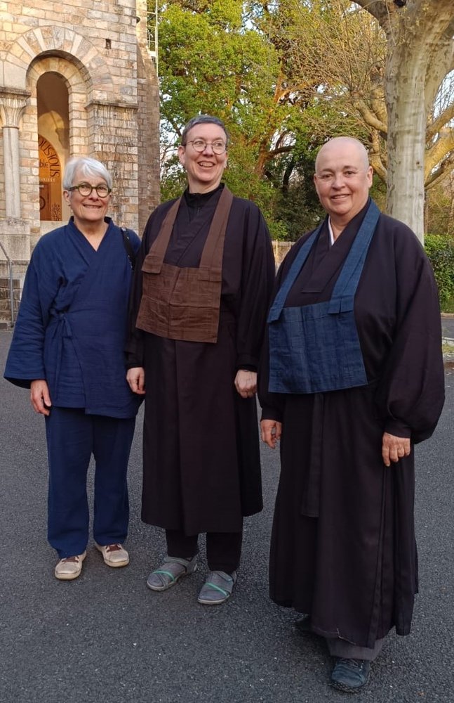 Trois moines de l'école zen Sotô, accompagnent le groupe de participants : Jokei-Ni, abbesse de Hokai-Ji, monastère La Demeure sans Limites en Ardèche, Myoshô, responsable du Dojô zen d'Angers, Mokushô, enseignant au temple Daishin Ji à Mons en Belgique.