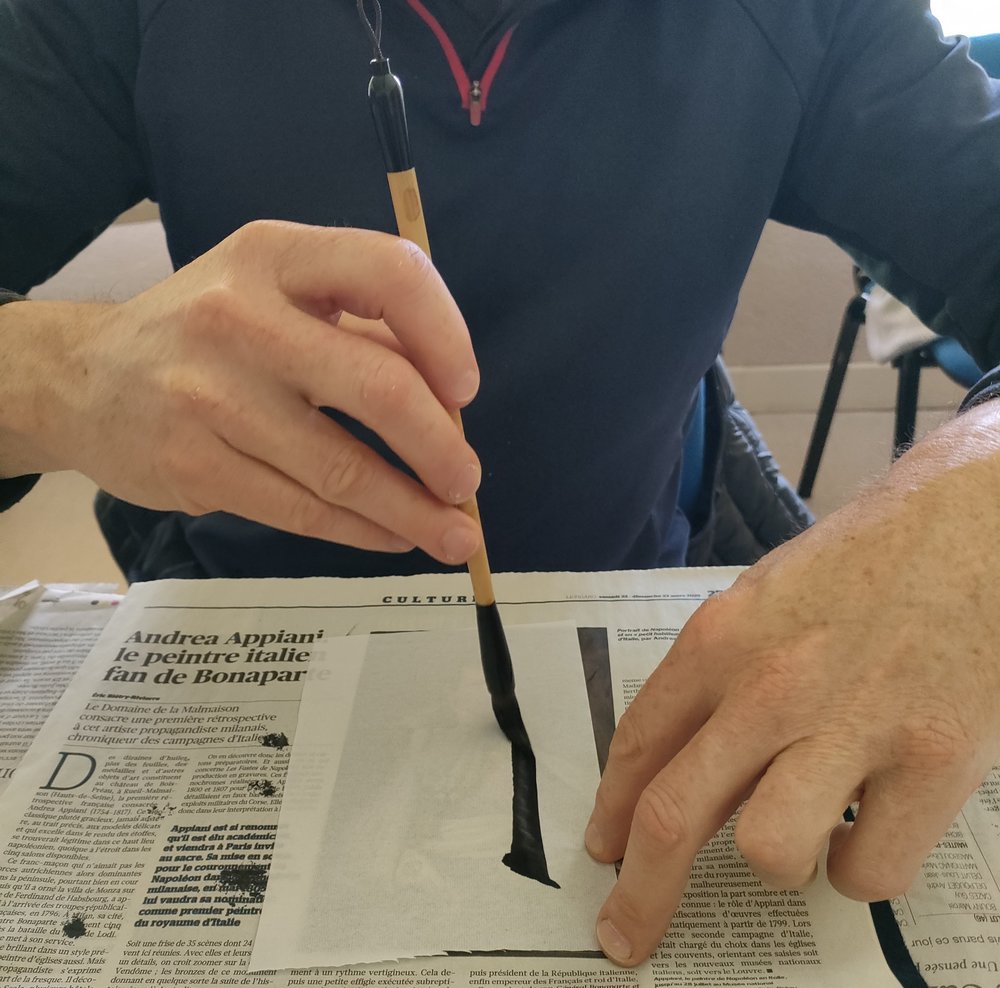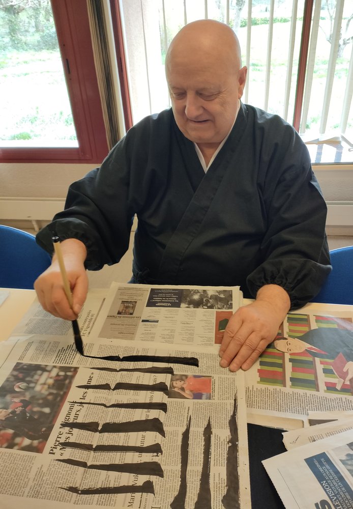 Dans la culture zen, « shodô », l'art de l'écriture, devient une voie spirituelle, de même que « kadô », la voie des fleurs et « chadô », la voie du thé. La quasi totalité des participants découvre la calligraphie : le matériel (pinceau, encre, papier), l'importance de la posture et du souffle, le geste. Avec application, tel un élève studieux devant sa feuille, chacun s'exerce à tracer ce qui du trait devient « kanji » - signe / sens. Les visages traduisent la surprise ou la joie d'adopter la posture de l'apprenti.