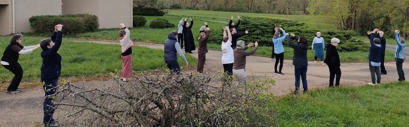Le programme de cette session intégrait une séance de Qi Gong quotidienne. Chaque matin après Laudes, zazen et le petit déjeuner, Michel nous entraîne de manière simple et bienveillante à mettre tout notre être en mouvement. Gymnastique traditionnelle chinoise fondée sur la maîtrise du souffle, associant mouvement lent et respiration, le Qi Gong consiste en un enchaînement de postures calées sur l'inspir et l'expir. La mise en énergie individuelle se propage à l'ensemble et se répand dans l'univers dont nous sommes un des éléments. Michel, médecin et maître avisé de Taïchi et Qi Gong, nous enveloppe de son sourire permanent et sait rejoindre chacun là où son être peut aller en cet instant.